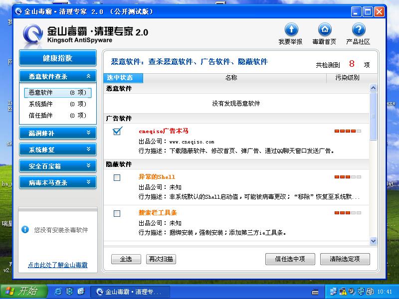 金山毒霸清理专家2.0 可以完全清理被安装的流氓软件和恶意插件(非广告,而是测试而得)