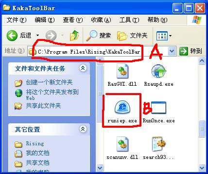 如果是瑞星杀软+防火墙套装+卡卡套装且保持缺省安装目录安装的话,请按照下图A处的路径找到RUNIEP.EXE这个程序,否则请用“RUNIEP.EXE”这个字段搜索,找到后双击。