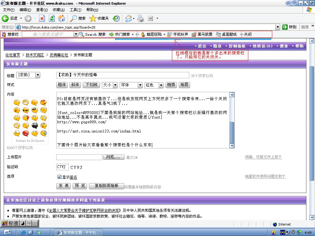 PS:目前是网页没有被篡改了...但是我发现网页上方突然多了一个搜索条来...一给个关闭它就又篡改网页了...真是气S我了...