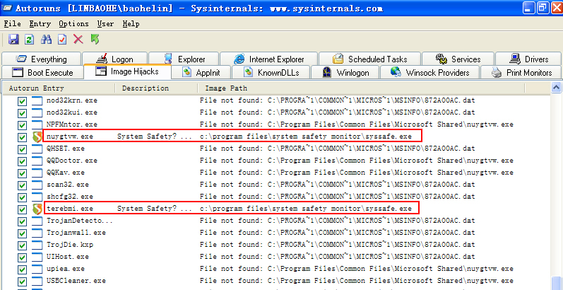 3、添加两个IFEO劫持项,将“随机7”的两个病毒程序劫持到SSM(syssafe.exe;图1)。