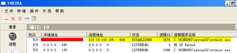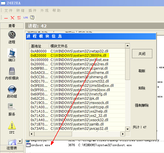 中招后,进程列表中可见高进程号svchost进程,内含病毒模块3800hk.dll(图1)。h.exe运行后自动将自身删除。