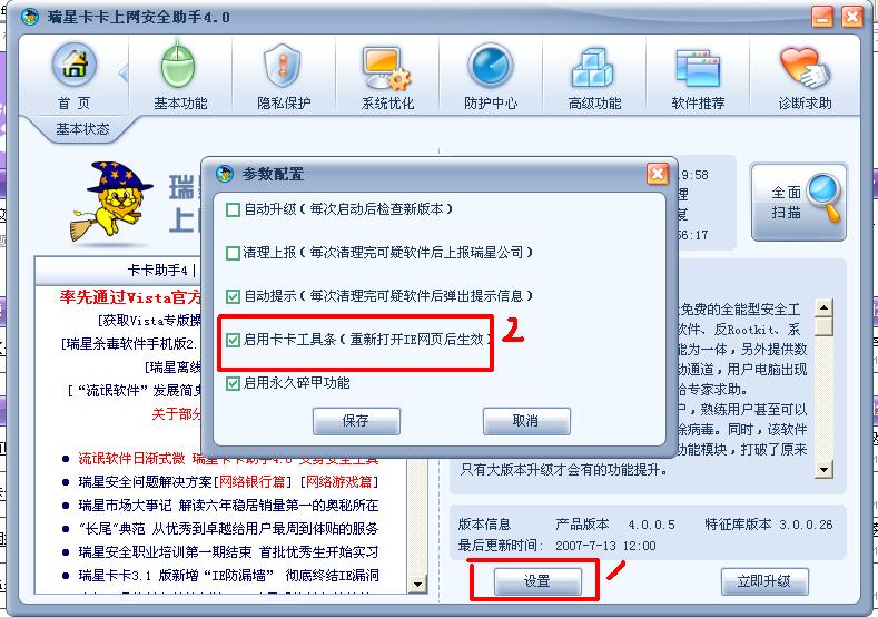 3、等待安装结束,双击卡卡图标,并按照下图步骤检查是否勾选了2处“启用卡卡工具条”这个选项,没打勾的打上后再按下方的“保存”按钮。