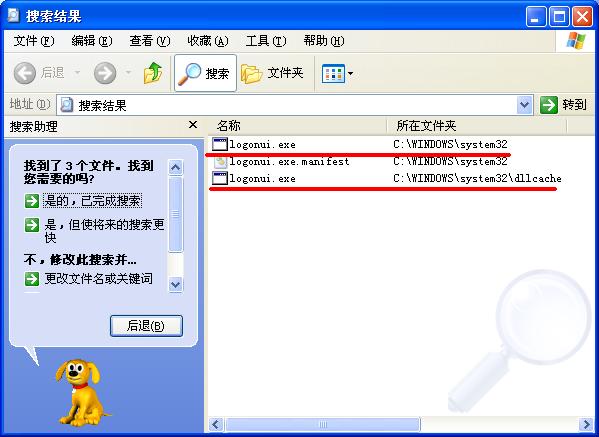 我的logonui.exe这个文件在c:\windows\system32\和c:\windows\system32\dllcache\目录下!