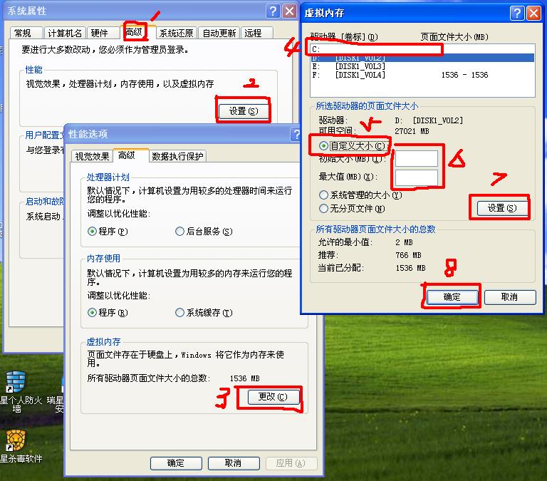在“我的电脑”图标上右键--属性,然后按图操作,在步骤6处两个框内的数据均修改为“1024”(前提是你的C盘有足够大的空间,否则请都修改为“768”或“896”),然后再进行下面的步骤。