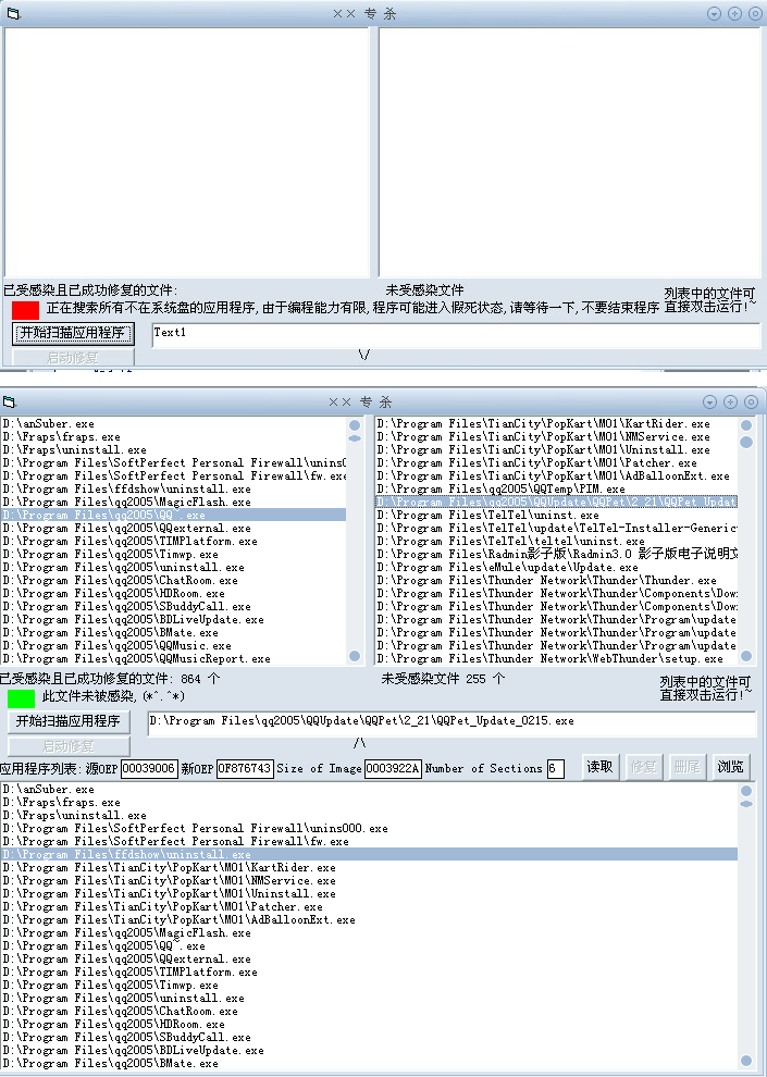 无聊之中,挨了2个通宵,自己弄了个专杀.. 侑需要的朋友可以问我拿. 由于程序用VB编写,只能单线程,所以很容易无响应,但不要结束,程序本身仍在正常执行,只是外界无法界入..PS:: (VB程序修复好像有点问题,但可以用 LOAD PE 在修复一次就能运行了