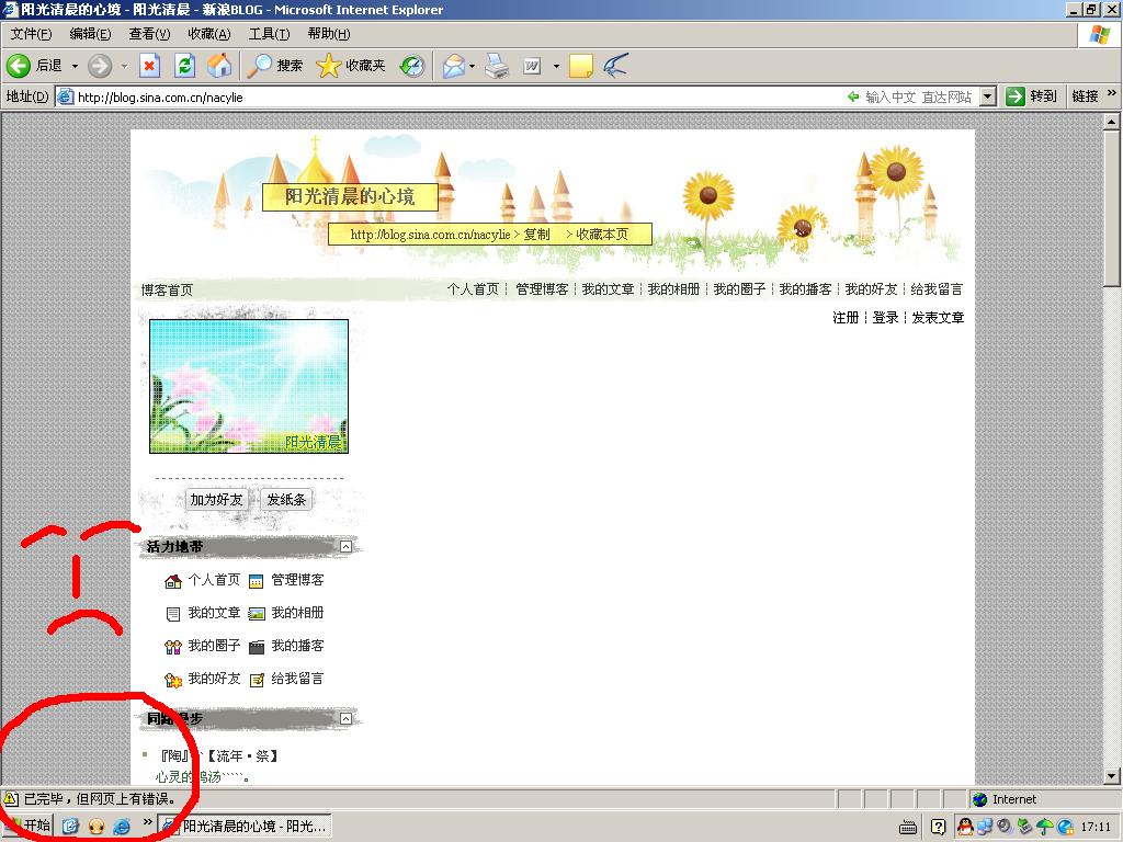 很多带有程序的页面,都不能正常打开,我用了很多办法修复,都不可以。例如:瑞星的卡卡工具、重新安装IE等等,我本来想换一个浏览器,就用了傲游(Maxthon),结果还是不可以,出现的问题和ie一样,我是在不知道怎么回事,我也不想重做系统,太麻烦了,就像我的图片一样,新浪的blog,只能打开一部分,文章部分读不出来。请你们帮帮我,谢谢