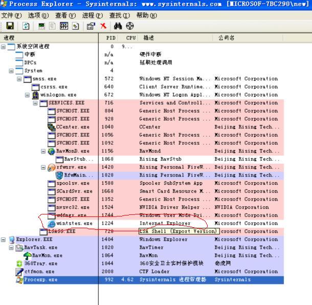 为了方便DX分析我把近期的情况说说。前几天电脑IE中流氓,也可能中马了。上网会不是的跳到广告网页(某某医院之类的)。开机IE自动启动(是进程启动,桌面没显示),卡卡,360,瑞星未查出。用PROCESS EXPLORER 查看启动IE进程的属性其映像标签下的当前目录为C:\WINDOWS\system32有问题,另外在线程中含有system32下的一个wintstes.exe和shell**.dll(shell后面记得不清,应该好象是32)。我用icesword删了wintstes.exe,问题依旧没解决。
