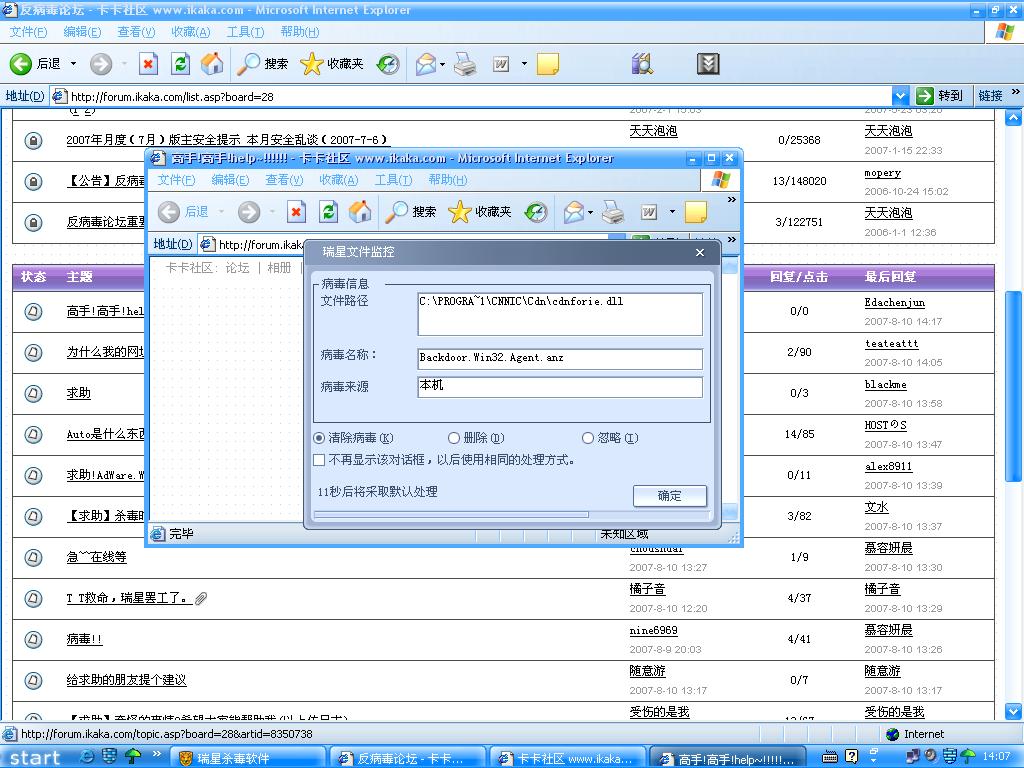 我中了Backdoor.Win32.Agent.anz...(C:\PROGRA~1\CNNIC\Cdn\cdnforie.dll)怎么办?怎么办?我电脑一直好好的~~~好象我瑞星怎么杀也杀不死啊!!