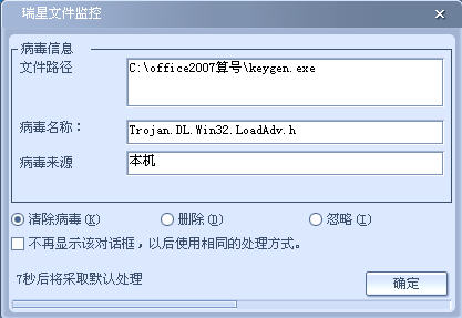 运行这个破解程序,要求指定一个解压目录。为此,我特意建立并指定了“C:\office2007算号”(图1)。包解压后,瑞星最新病毒库可以发现并杀掉此目录中的KeyGen.exe(图2),但查不到它释放的那个DLL木马(一个随机文件名的DLL)。SRENG日志可见:
