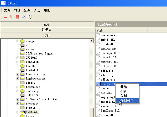 变换策略,试图先删除其加载项,再重启、删除efccywt.dll。结果,删除那两个加载项后,系统假死。重启后,那个DLL依然加载运行!汗!!