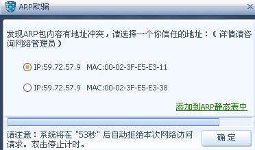 这几天瑞星防火墙总是提示说:“发现ARP包有地址冲突,请选择一个你信任的地址,系统将在60秒内阻止该行为”
