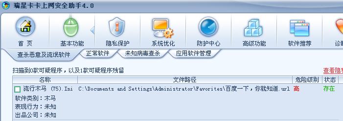 使用百度后如果将百度放入收藏夹再使用卡卡扫描就出现报警,如果使用卡卡删除之后,收藏夹中的百度也就没了.再上百度就再次能扫描到.