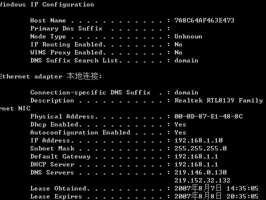 在窗口中输入IPCONFIG就出来了,显示的是你机器的IP地址及MAC址