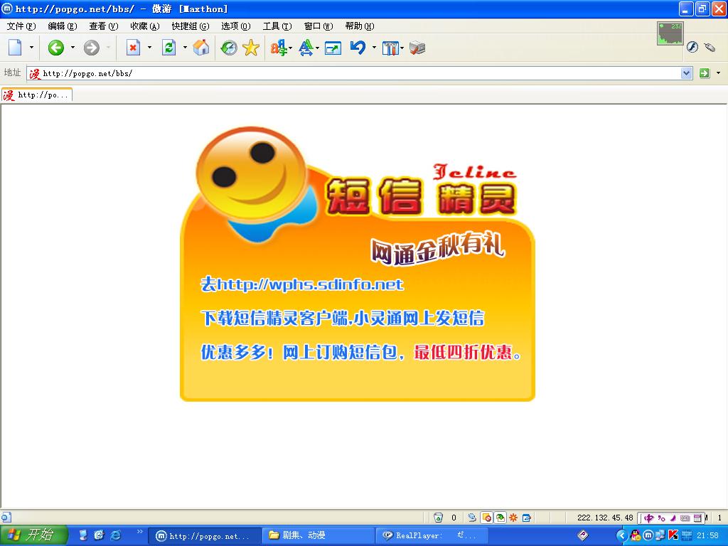 第一次发现这个是在今天晚上打开漫游的时候出现的,看了下地址栏里面显示的还是popgo.net/bbs的地址,后来再次看到它是在打开blog的某个友情连接时,这次地址直接变成了61.156.20.1/0001.htm
