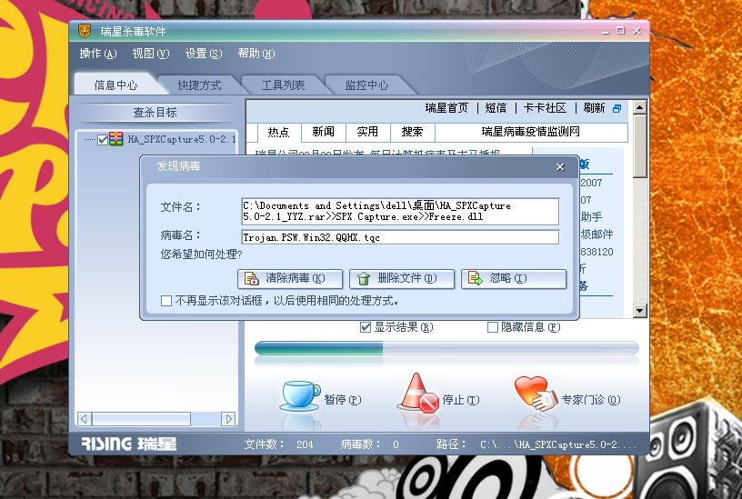 有朋友使用 SPX截图工具的吗? 你用瑞星2007 查毒的时候 瑞星有提示 SPX 里有Trojan.PSW.Win32.QQHX.tqc 病毒吗?