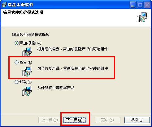 开始--程序--瑞星杀毒软件--添加删除组件--勾选“修复”--下一步
