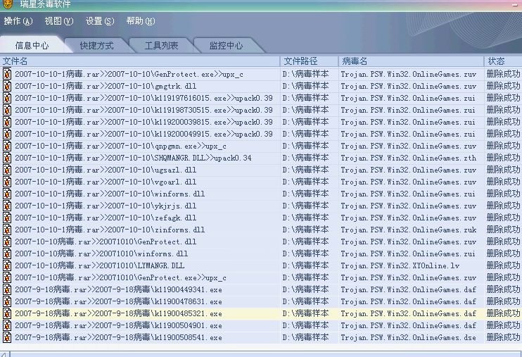 看看瑞星的病毒库更新速度,超慢,一般发上去的毒都要一两个月才能杀,我晕S了,刚才的病毒库已经是最新的19.45.20,每次给他们发上去的病毒样本最快的也要三天,最慢的要几个月,哎……,瑞星快加快脚步吧,我们等不了你呀