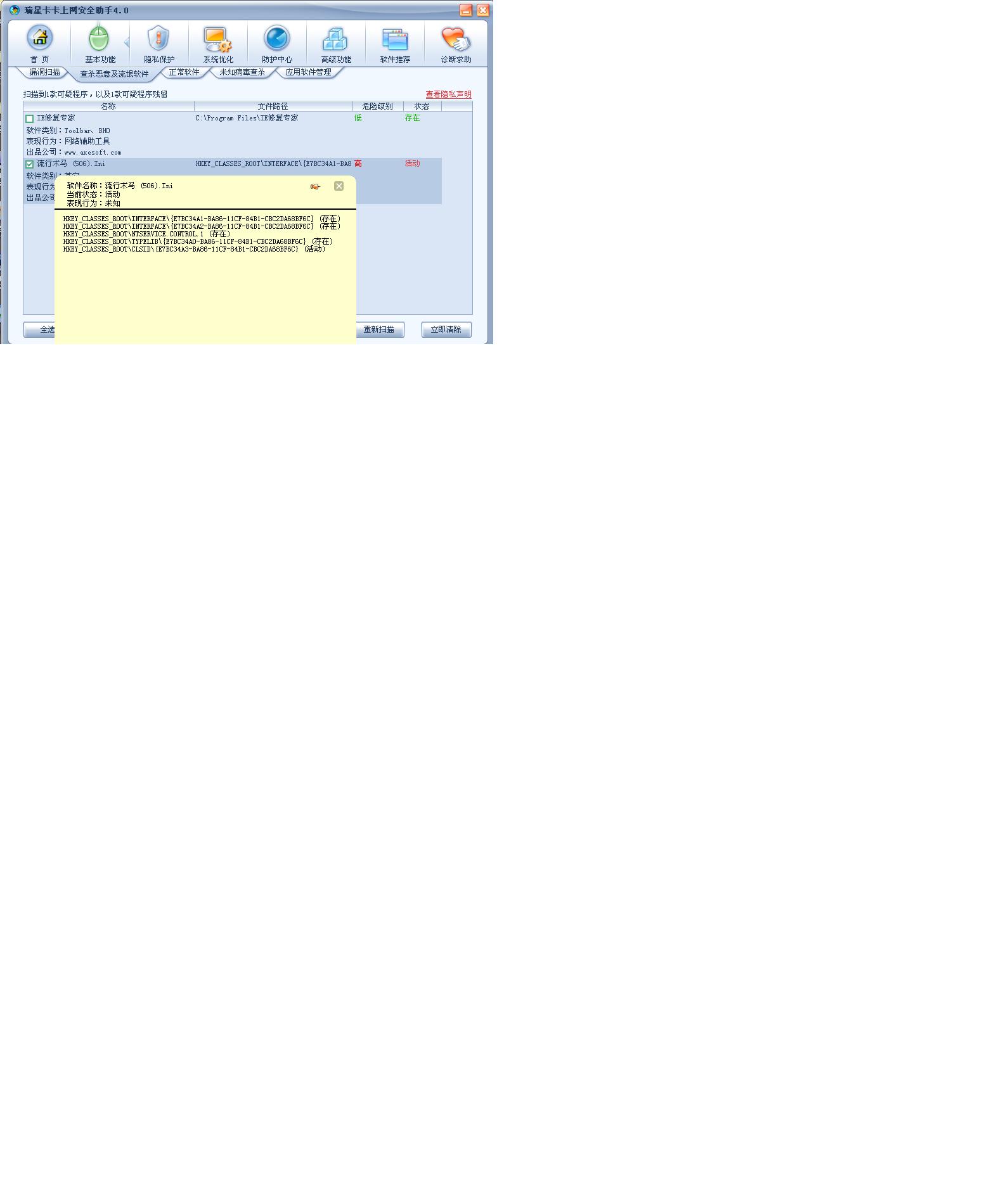 流行木马(506)Ini,每次开机卡卡都找到了,无法根除,怎么办?好像是注册表里的。
