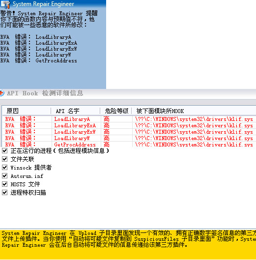 RVA  错误: LoadLibraryExA (危险等级: 高,  被下面模块所HOOK: \??\C:\WINDOWS\system32\drivers\klif.sys)