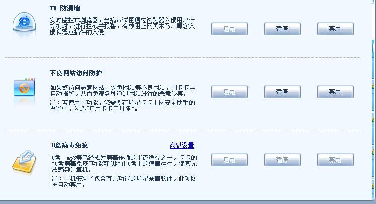 卡卡助手怎么部分功能暂停? 而且U盘免疫功能的几个按钮都不亮(见图)