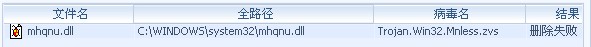 杀毒时出现了mhqmu.dll病毒,清除不了...(附附件),开机时出现连接错误,按确定后才能进入系统,请指教,谢谢!