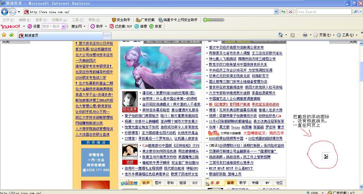 卡卡上网助手在IE7,拦截广告拦截“浮动广告”时虽有拦截,但不能彻底粉碎,仍有一个小图标仍然浮动在网页上(如下图)。强烈建议下个版本能及时解决!