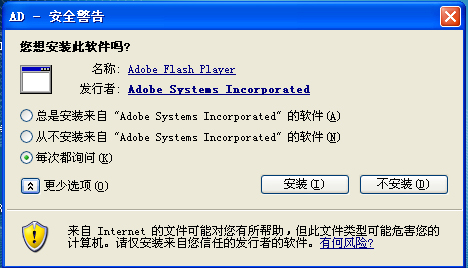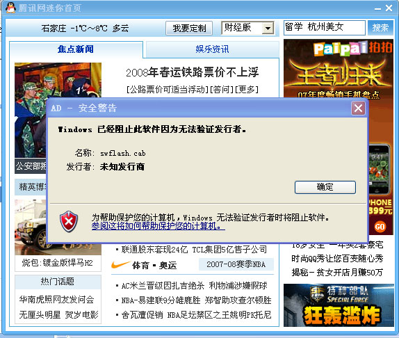 最近登录QQ的时候,滕讯网迷你首页上的flash动画总是不能正常播放,并且老弹出个对话框(见下图),请问大家有遇到和我一样的情况吗?