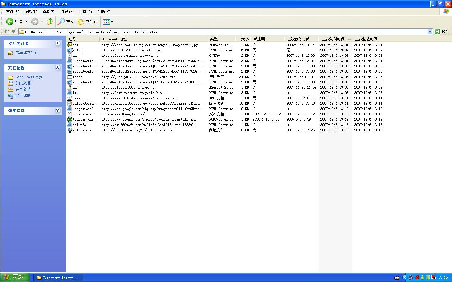 这个问题是这样,当我打开网页的时候IE总是先定向到http://love.netskys.com上,但这网址是以HTM文件存于临时文件夹下,用KILLBOX删除时提示找不到文件,在WINDOWS里删没任何反映,在DOS提示没有该文件,我用SRENG和360来找也都查不出来,它在临时文件下有个LZ.HTM的文件,还有一个TESTS.EXE文件,这个文件可以删除,但是一上网就个文件就会重新出现,我将LZ.HTM文件COPY到别的盘进行编辑一下发现网页主体是一些看不懂的字符,这就导致打开网页时总提示网页错误,不断的弹出窗口,网页也无法打开,我在附件中有这个临时文件有这个图片,大伙帮忙分析一下,有没有见过类似的情况.
