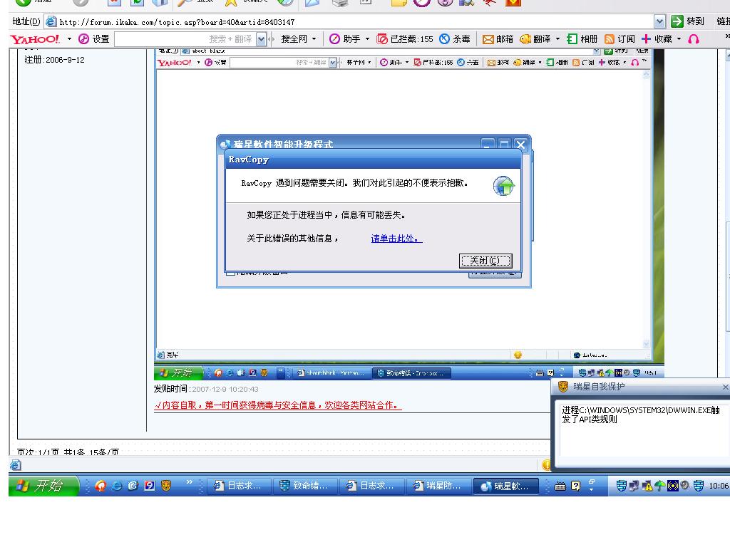 我的电脑现在纵使有杀不完的毒,并且瑞星杀毒跟防火墙都不能升级,开机以后出现以下提示框,一会上图,谢谢!