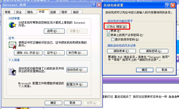 我的IE不能记录我上过的网址了 每次都要我重新打过 重启后就没了 我改过注册表可后来也一样 急急急啊