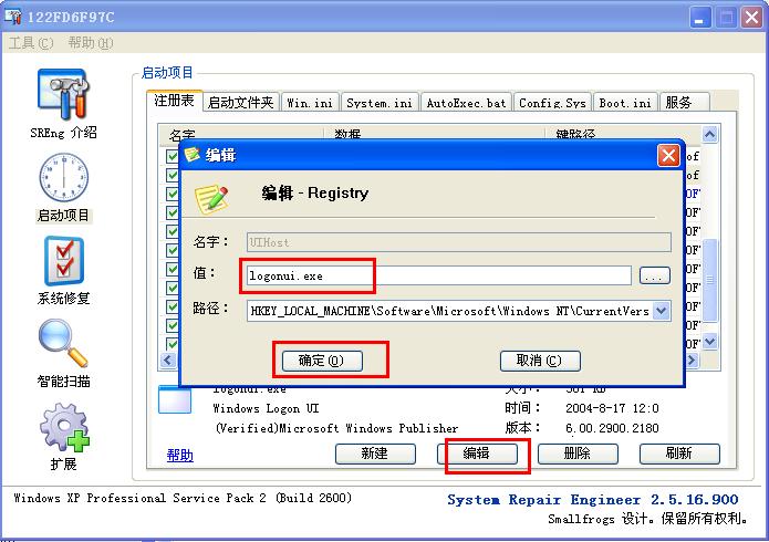 在扫日志的SRENG工具》启动项目》注册表》里面找这<UIHost>项修改值为Logonui.exe