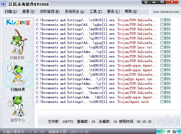 我一直是瑞星用户,以前用的是瑞星2007下载版网上支付,刚前两天到期,今天删了瑞星2007后下载瑞星2008并选了支付一年费用。没想到让我伤心的是安装瑞星2008后机子卡的无法动,我的机子配置并不低,目前来说我的机子可以说是家庭用户高配置,可是机子卡的无法运行,刚支付好后我就用瑞星2008把硬盘全面杀了一次毒,结束没有发现任何病毒,但是机子卡的无法运行,我只好删了瑞星2008,又下载了江民KV2008支付了一个月,又进行了一个全面杀毒,竟然查出来19个病毒,为什么瑞星没有杀出来呢?我是一个游戏玩家。我怕被盗,我随然不知道杀出来的19个病毒是否可以盗我的游戏号,但是既然查出来删了。我心里也就安心了,难到这就是两家公司产品的区别吗?