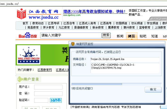 您好,我的网站是http://www.jxedu.cc 电脑装的是瑞星正版的杀毒软件,打开网站时出现发现病毒,但是我把网站整站下载下来,用瑞星扫描又找不到病毒,为什么,求助!