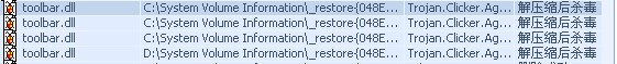 我在家用瑞星杀毒 发现了 多个Trojan.Clicker.Agent.aty 名称的病毒 ,可是杀毒结果显示的是:解压缩后杀毒(如图) 拜托大家帮帮忙啊 我菜鸟。。。