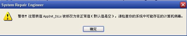 警告!注册表值AppInit_DLLs被修改为非正常值(默认值是空)。请检查你的系统中可能存在的计算机病毒。