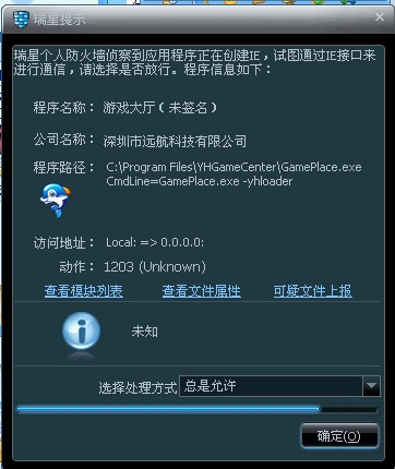 远航游戏,每次启动总是反复出现瑞星防火墙提示。选择“总是允许”后,启动还是出现。另外电脑出现变慢、硬盘灯长时间亮(运行很长时间)。