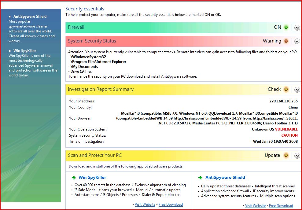 主要表现是浏览器被劫持,主页被更改成防vista安全中心的页面.