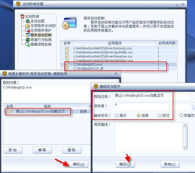 3、瑞星虽然目前还不能杀此毒,但中招用户完全可以利用上面提到的时间差,打开瑞星2008的主动防御设置界面。界面打开后,病毒才开始运行。此时,系统桌面依然被一片蓝色覆盖;但已经打开的瑞星2008主动防御设置界面不受病毒影响,用户照样可以根据需要设置“程序启动控制”规则(图1),禁止病毒.exe和.dll加载。