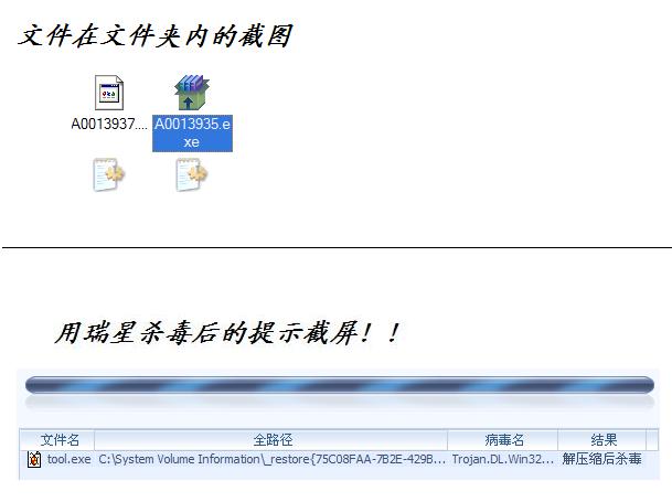 【vivianlee1314的贴子】用瑞星查出Trojan.DL.Win32.Mnless.yyd这个病毒,提示处理结果为[需要解压缩后杀毒]。杀了好几遍,此病毒依然存在。安全模式下亦杀不掉!是否可以直接删除A0013935.exe??此文件是否系统文件?大侠来帮忙!