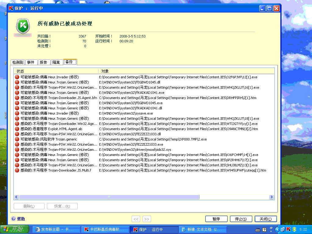 已隔离:病毒 Heur.Trojan.Generic (修改)    文件: E:\Documents and Settings\马龙\Local Settings\Temporary Internet Files\Content.IE5\6P2R4H67\17[1].exe//PE_Patch//UPack//data0000.bin//UPack