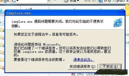 结果过了会上网,没隔几分钟就出现,“iexplore.exe遇到问题需要关闭。”这个提示,随便按发送错误报告或者不发送,网页就会全部关闭或者关闭其中几个。
