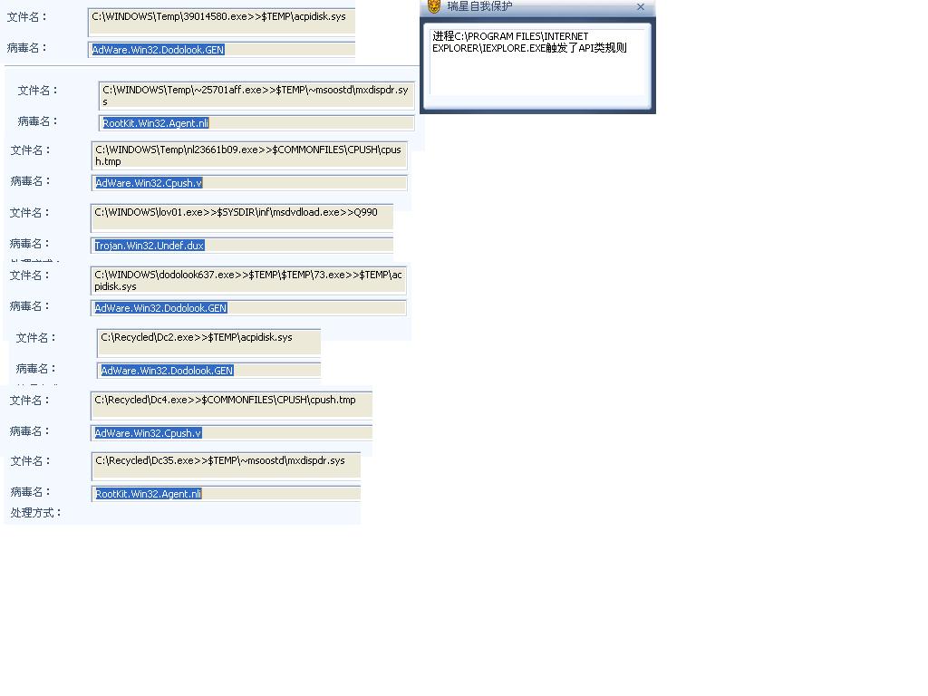顺便把几个截图传上来(我在“http://forum.ikaka.com/topic.asp?board=28&artid=8394593&page=5第97楼传过几张”),这里是今天开机杀的几个,提示电脑中仍存在病毒。
