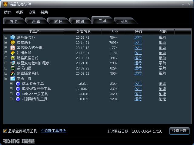 运行瑞星杀软,选“工具”,点开“专杀工具”,运行“DiskGen专杀工具”。