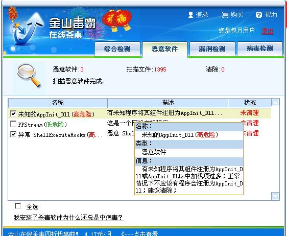 4月5日中的磁碟机病毒,我按照清除病毒的方式.清楚后并下载了最新的免费版,清理完病毒后,我又去了金山的在线免费查毒.(因为有朋友的手机账号注册)结果发现两个病毒,杀毒后,显示需重起后清除.但重起后扔不能清楚,并且用瑞星查杀不到````!请高手指点!