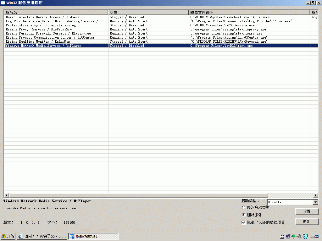 打开SREng-在"启动项目->服务->"Win32服务应用程序"选中"隐藏已认证的微软服务" 然后将下面名称的服务删除(选中有问题的服务后,点“删除服务”,点“设置”按钮即可。 注意弹出的窗口中要点 “NO 否”才是确认删除服务)(不能删除的就禁用:启动类型改为disabled,点中修改启动类型,点设置):
