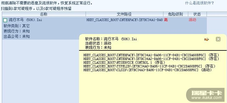 近日,用卡卡助手查杀恶意及流氓软件项发现流行木马506.ini