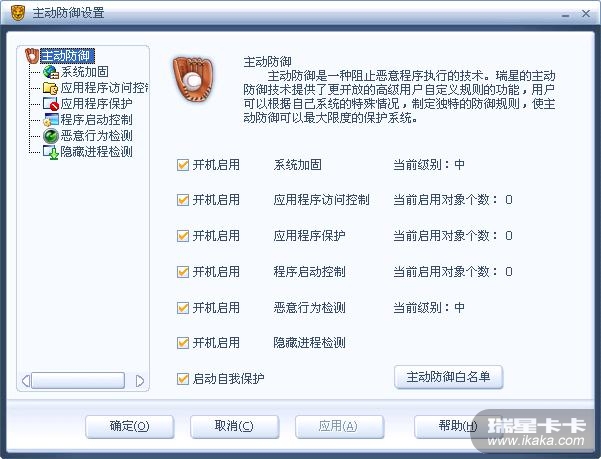 2、右键系统托盘的小绿伞,选择“主动防御设置”,输入验证码后点“确定”,看看下图的项目是否均已勾选,如果没勾的勾上: