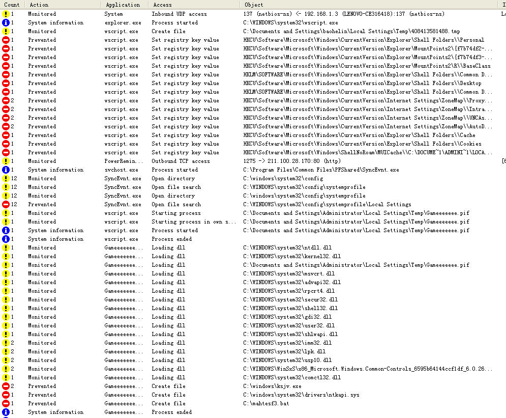 样本提供者还提供了一个Gameeeeeee.vbs。监控了一下其运行:Gameeeeeee.vbs运行后,到C:\Documents and Settings\Administrator\Local Settings\Temp目录下找Gameeeeeee.pif。找到后,即刻加载运行之。看来,这可能是个来自网络的脚本病毒。