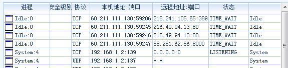 我查过进程、启动项、服务、驱动、IE和资源管理器插件等,都是卡卡助手标志为安全的或有可信任厂商签名的,没有签名的项我也都可以100%确定安全,用最新病毒库的瑞星查毒也没有任何结果,卡卡的流氓软件扫描和系统修复也没有任何扫描结果,瑞星的扫描隐藏进程没有结果,用冰刃和瑞星防火墙查到的也是同样不明TIME_WAIT,最奇怪的就是显示的进程是PID为0的Idle
