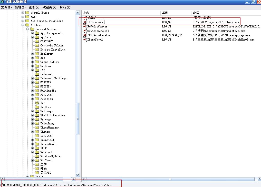 如果在“启动”页,找不到ctfmon项,说明注册表中已将该项删除,可以单击“开始”——>“运行”——>输入“regedit”(引号不要输入),回车——>打开“注册表编辑器”,定位到HKEY_CURRENT_USER\Software\Microsoft\Windows\CurrentVersion\Run,在窗口的右侧新建名字为ctfmon.exe的字符串值(REG_SZ),并将其值设置为“C:\WINDOWS\system32\ctfmon.exe”,然后关闭注册表编辑器,再执行前一步的操作即可.